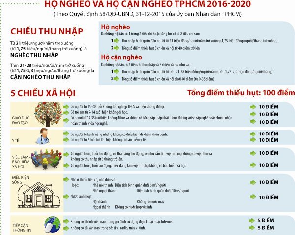 Tổng cá»™ng trong “5 chiá»u xã há»™i” há» bị thiếu hụt đến 40 Ä‘iểm và ngay láºp tức há» sẽ được xếp vào diện há»™ nghèo (bất kể thu nháºp 100 triệu đồng má»—i tháng). Äó là bởi há»™ nghèo ở TPHCM được định nghÄ©a là há»™ dân có 1 hoặc cả 2 tiêu chí: có thu nháºp bình quân từ 21 triệu đồng/ngưá»i/năm trở xuống; Có tổng số Ä‘iểm thiếu hụt cá»§a 5 chiá»u nghèo (các dịch vụ xã há»™i cÆ¡ bản) từ 40 Ä‘iểm trở lên.