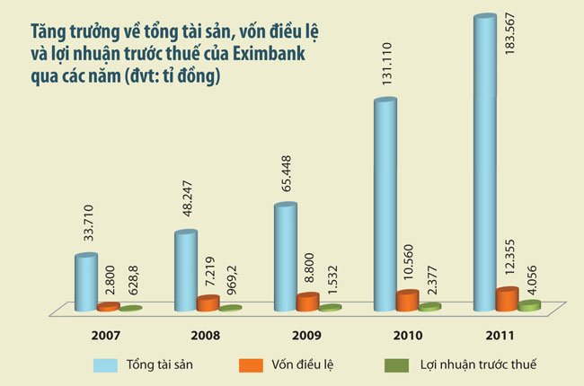 - Äúng là Eximbank Ä‘ã liên tục tăng vốn trong các năm trước Ä‘ó, bên cạnh vốn Ä‘iá»u lệ tăng hàng năm thì các chỉ tiêu khác như tổng tài sản, huy động vốn, dư nợ và lợi nhuáºn cÅ©ng tăng trưởng hàng năm. Cụ thể như lợi nhuáºn trước thuế cá»§a ngân hàng từ mức 1.500 tỉ đồng cá»§a cả năm 2009, đến hết năm 2011, con số này là hÆ¡n 4.000 tỉ đồng.